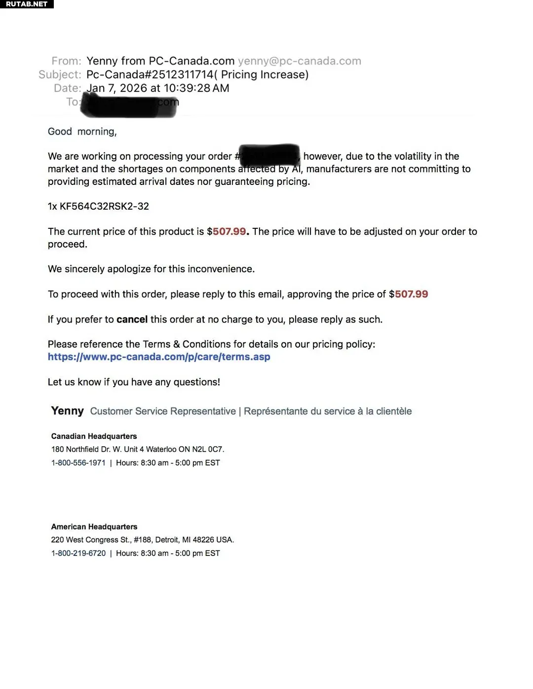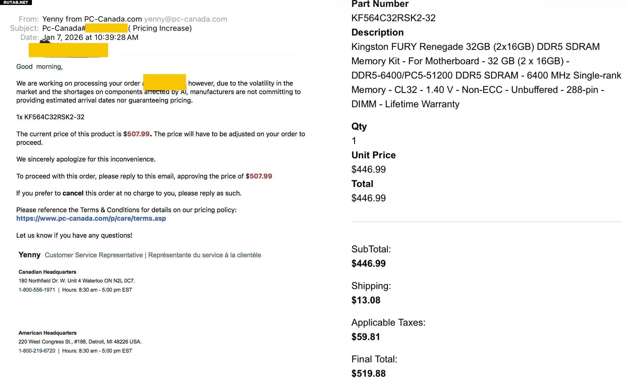 Согласно первоначальному счёту, комплект памяти стоил 446,99 канадских долларов (~35700 рублей). С учётом доставки и налогов итоговая сумма составляла 519,88 канадских долларов (~41600 рублей). PC-Canada предложила новую цену в 507,99 канадских долларов (~40600 рублей) только за модули памяти, что на 61 канадский доллар (~4900 рублей) дороже первоначальной стоимости, а общая сумма заказа с учётом всех компонентов стала ещё выше.