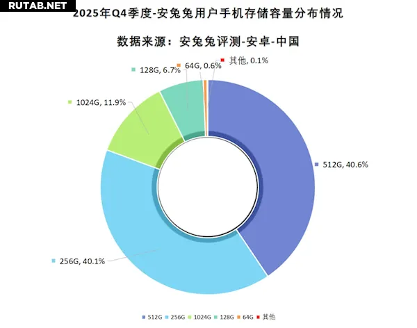 Данные бенчмарка AnTuTu за четвертый квартал 2025 года показывают: доля пользователей со смартфонами на 1 ТБ встроенной памяти достигла 11,9%, что вдвое больше показателя предыдущего квартала (5,7%). В то же время доля моделей с 64 ГБ составляет всего 0,6% и практически сошла на нет.