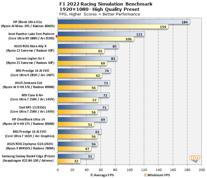 В тесте F1 2022 графика Radeon 8060S в составе Ryzen AI Max 395 остаётся самой быстрой, показывая в среднем 184 fps против 121 fps у Arc B390 в X9 388H. Преимущество AMD составляет около 50%, и в этом их первый аргумент верен.