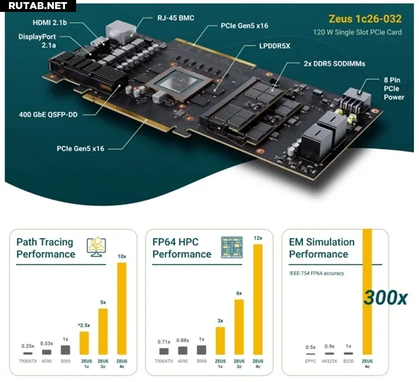 В частности, в трассировке лучей (path tracing) версия ZEUS 1C обещает быть в 2.5 раза быстрее RTX 5090, версия 2C — в 5 раз, а флагманская 4C — более чем в 10 раз.