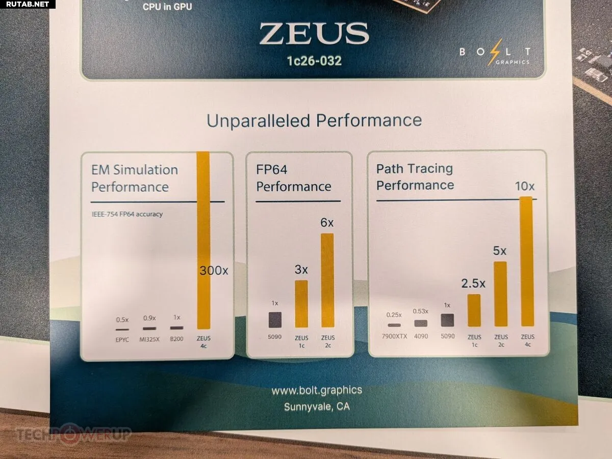 В AI-вычислениях, по словам Bolt Graphics, производительность ZEUS 4C в эмуляции (EM simulation) более чем в 300 раз превышает показатели топовой AI-карты NVIDIA B200, что делает её потенциальным «убийцей» решений NVIDIA.