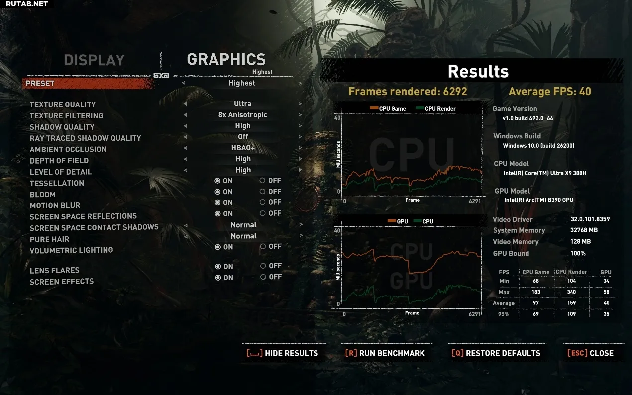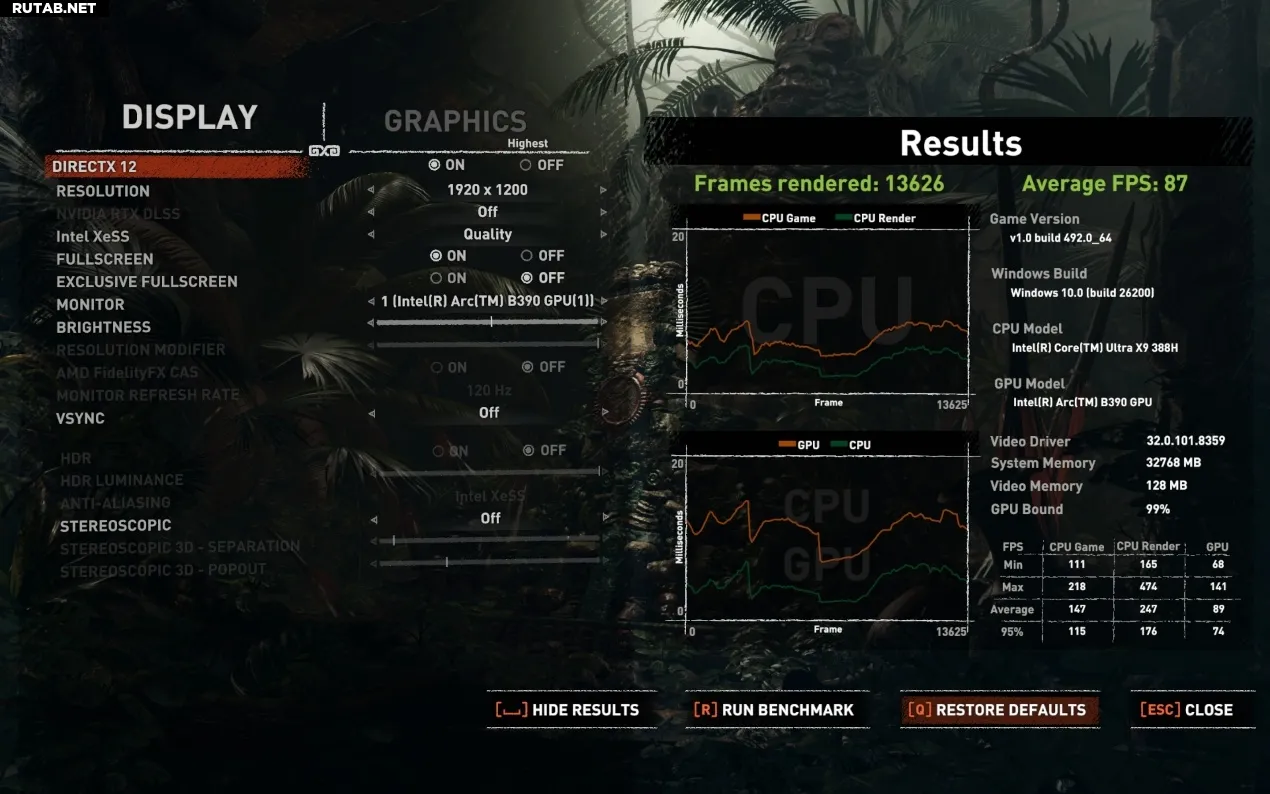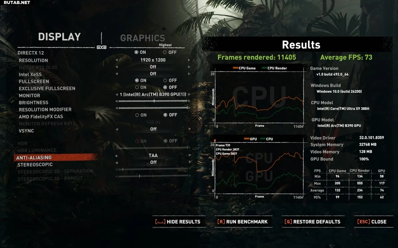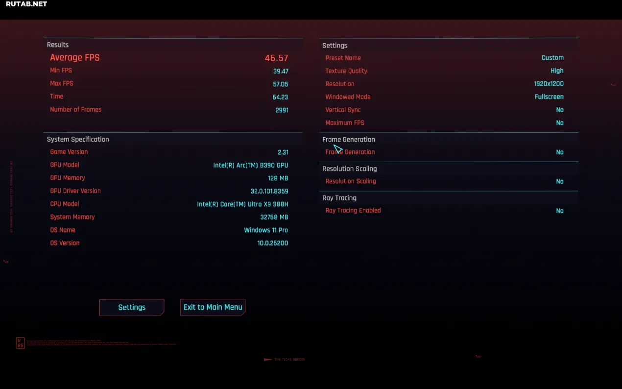 Игра была протестирована в нескольких режимах. В типичном сценарии — разрешение 1920×1200, высокие настройки графики, без трассировки лучей, сверхразрешения и генерации кадров — средний показатель составил 46.57 FPS, что для встроенной графики является неплохим результатом. При более распространённом разрешении 1920×1080 достичь 60 FPS не составит труда.