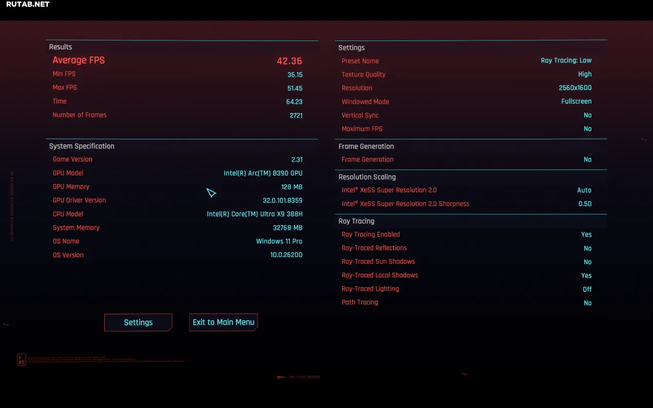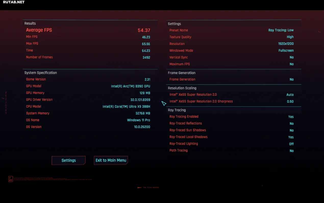 При активации трассировки лучей на минимальных настройках и автоматического режима XeSS 2.0 средний FPS составил 54.37, что также можно считать приемлемым.