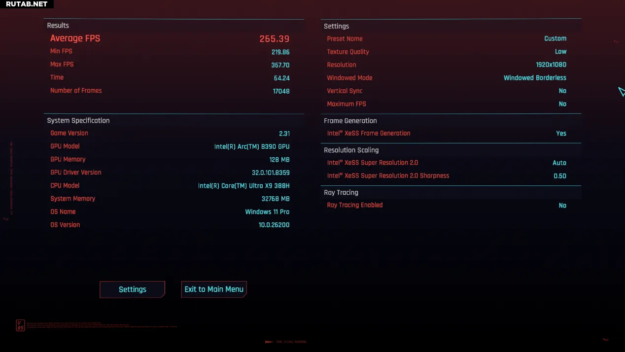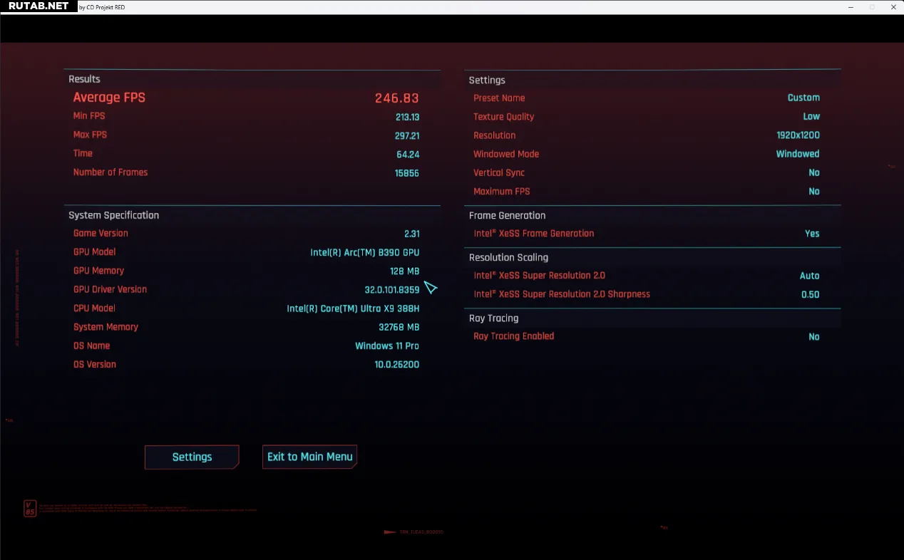 Наиболее впечатляющими стали результаты с технологией многокадровой генерации (MFG). В «Cyberpunk 2077» при разрешении 1920×1080, низких настройках графики, выключенной трассировке лучей и включённых MFG и XeSS (автоматический режим) был зафиксирован средний показатель в 265 FPS, а пиковый достиг 367.7 FPS.