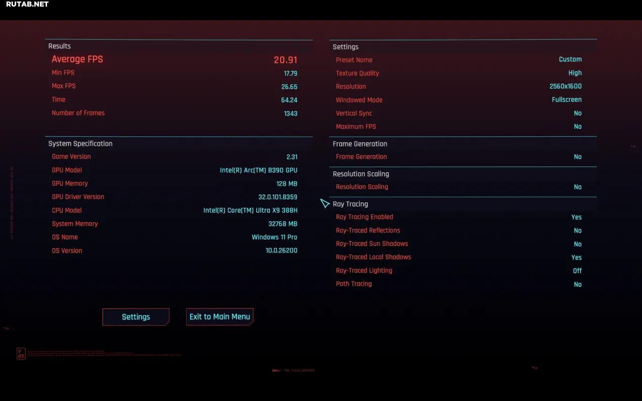 При повышении разрешения до 2560×1600 с высокими настройками и включённой трассировкой лучей средний FPS упал до чуть более 20.