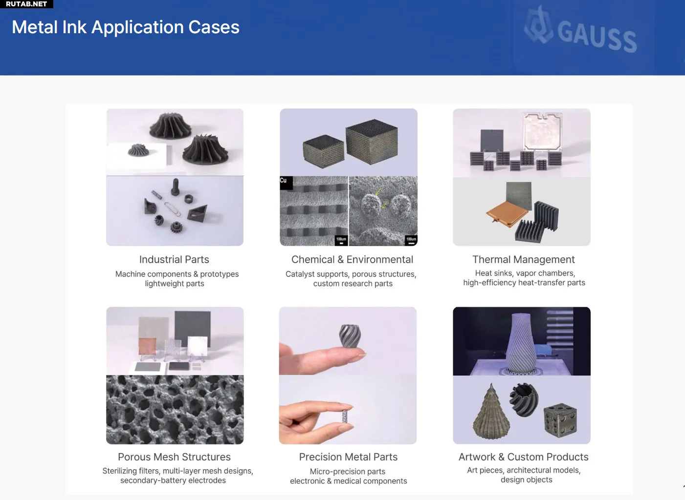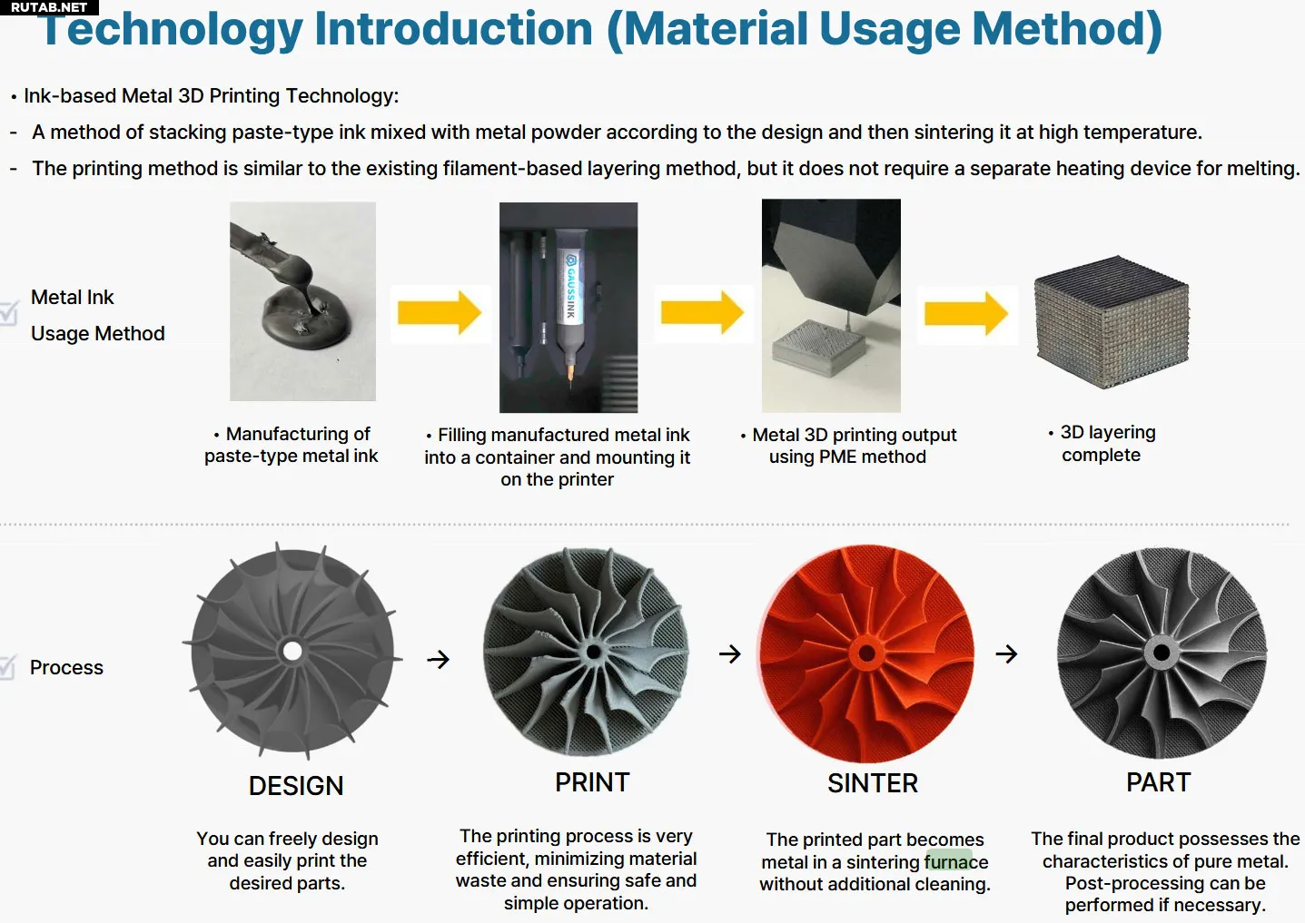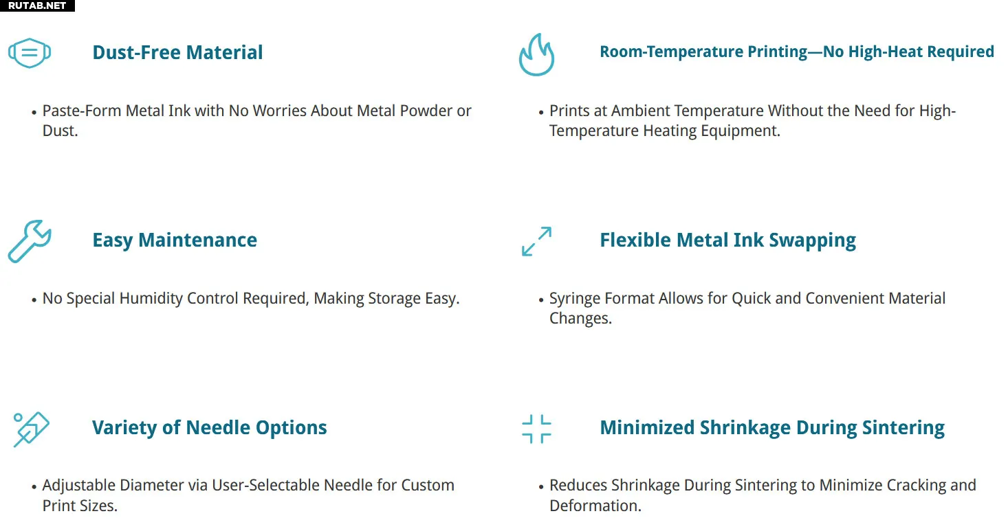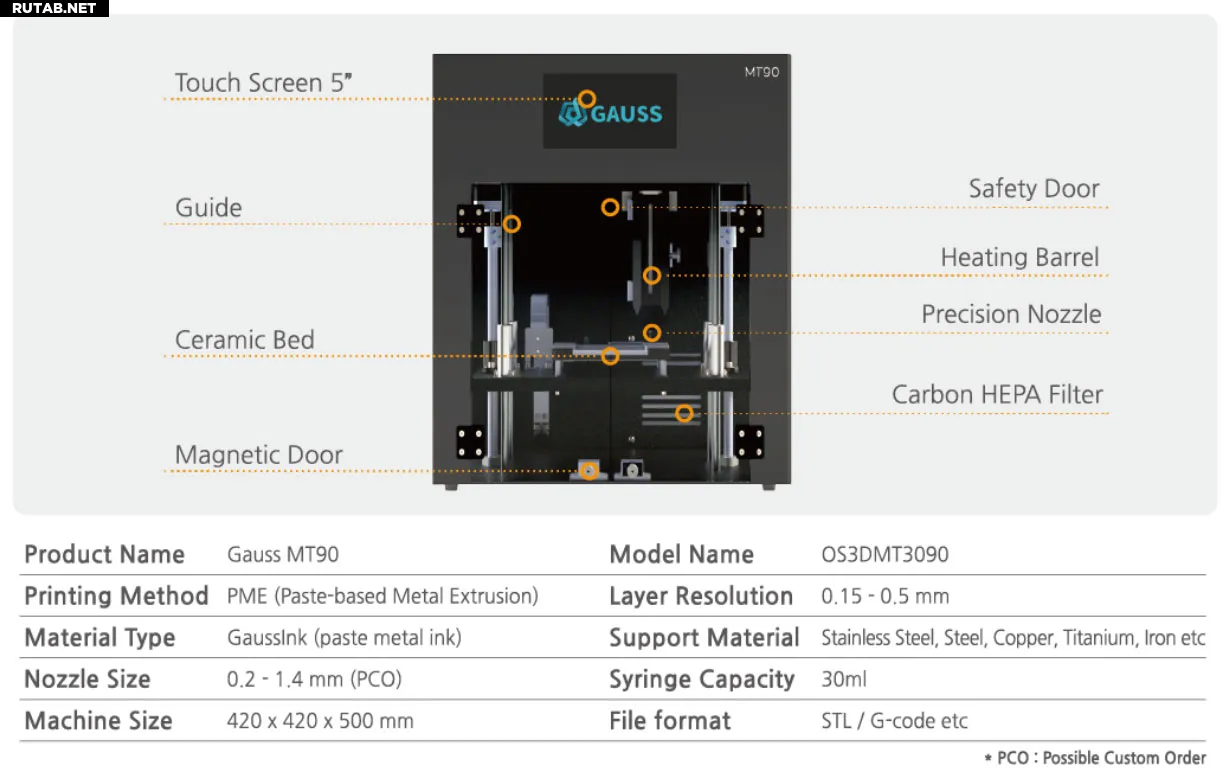 Gauss MT90 кардинально меняет ситуацию. По размерам и внешнему виду он напоминает обычный настольный 3D-принтер, работает при комнатной температуре и использует сменные картриджи «GaussInk» с пастой из нержавеющей стали, меди, титана, никеля, железа и даже вольфрама. Компания также заявляет о возможности изготовления чернил по индивидуальному заказу, в том числе сплавов.