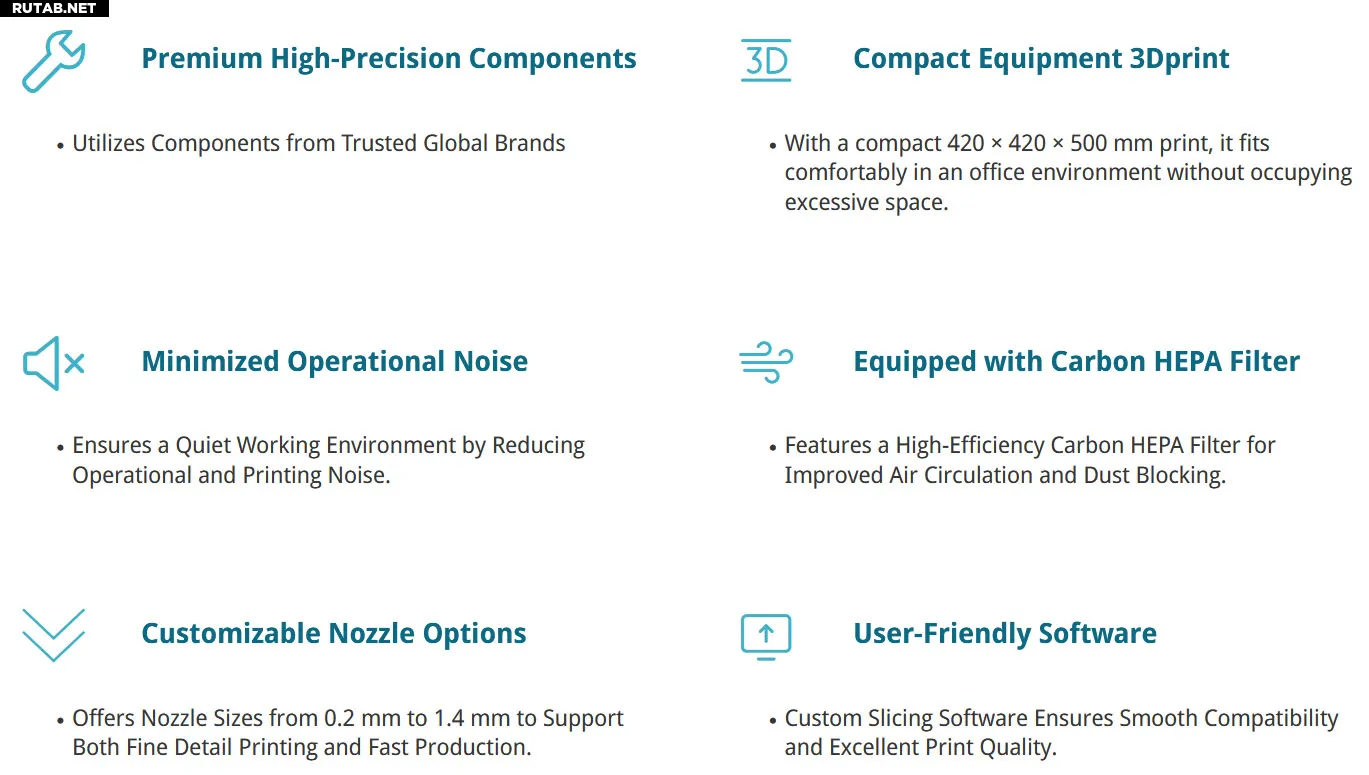 Устройство оснащено встроенным HEPA-фильтром для минимизации выбросов, 7-дюймовым сенсорным экраном для управления и камерой с поддержкой ИИ для контроля процесса. Уровень шума составляет около 40 дБ, что сопоставимо с тихой беседой.