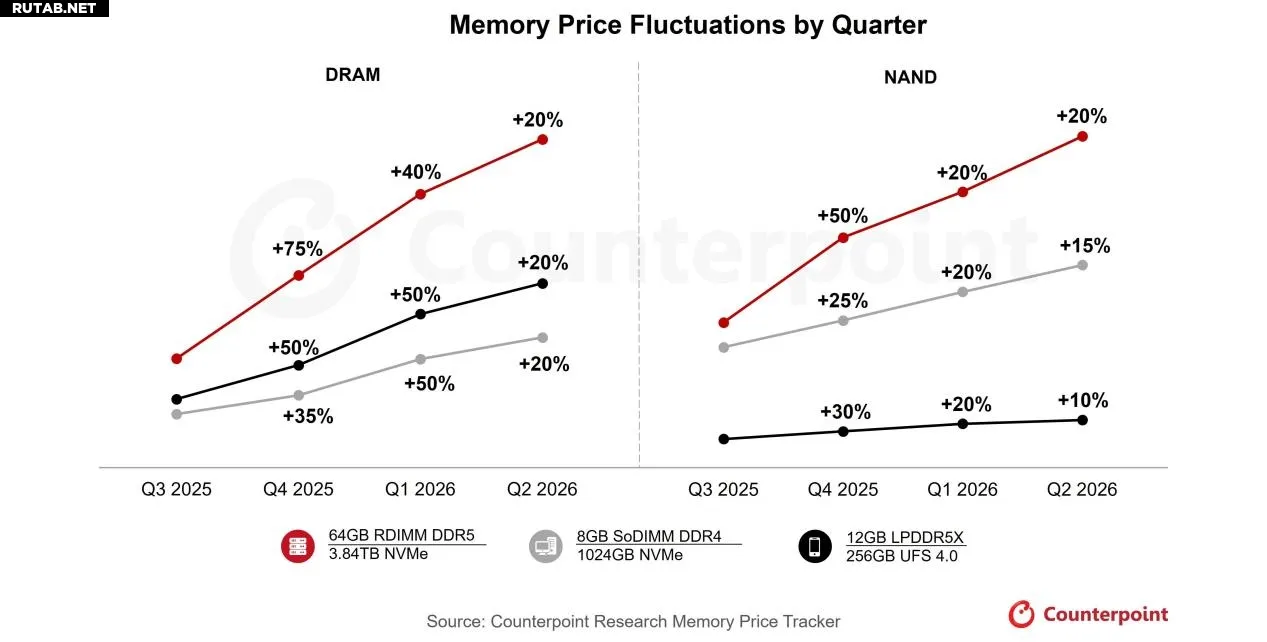 Аналитики прогнозируют, что в четвёртом квартале 2025 года цены на память вырастут на 40–50%. В первом квартале 2026 года ожидается дальнейший рост на 40–50%, а во втором квартале — ещё примерно на 20%.