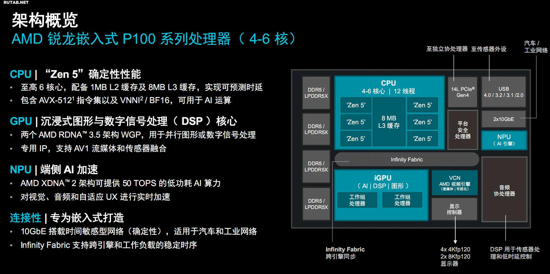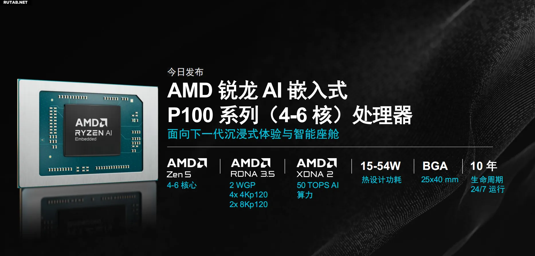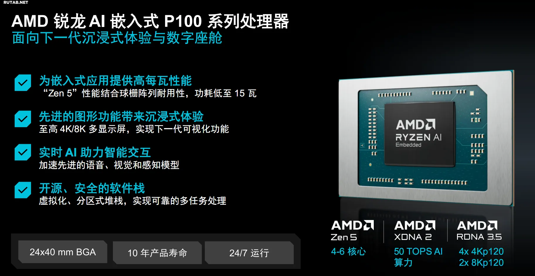Новые процессоры Ryzen AI Embedded P100, по сути, являются родственниками мобильных чипов Ryzen AI 300 серии (кодовое имя Strix Point). Они созданы по 4-нанометровому техпроцессу и используют архитектуры Zen 5 (CPU), RDNA 3.5 (GPU) и XDNA 2 (NPU). Ключевыми особенностями для встраиваемых систем стали поддержка круглосуточной работы (24/7) и гарантированный 10-летний жизненный цикл.