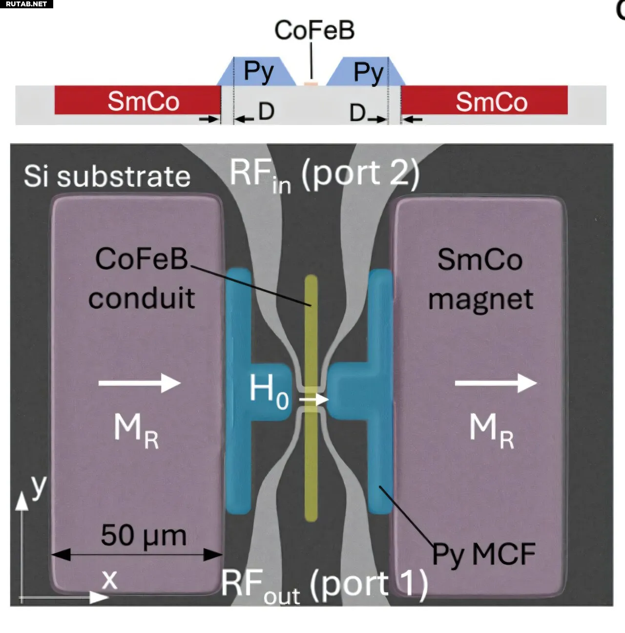 Волновод из CoFeB оснащён двумя антеннами для ввода и вывода ВЧ-сигнала. Поперечное магнитное поле можно точно модулировать, варьируя расстояние между магнитами и концентраторами от 11 до 20,5 мТл. Это позволяет настраивать рабочую частоту в диапазоне от 3 до 8 ГГц и регулировать фазовый сдвиг до 120 градусов на частоте 6 ГГц.