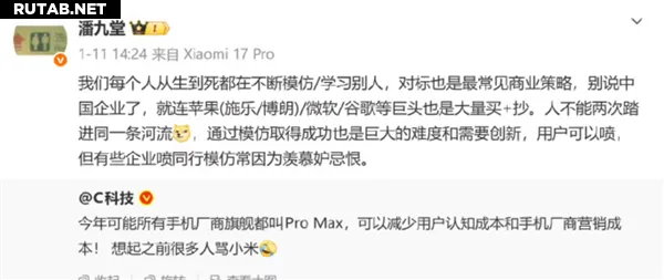 «Каждый из нас от рождения до смерти постоянно кого-то имитирует или учится у других. Ориентирование на конкурентов — самая распространённая бизнес-стратегия. И это касается не только китайских компаний. Даже зарубежные гиганты, такие как Apple (у Xerox и Braun), Microsoft, Google, тоже массово покупают и копируют», — заявил Пань Цзютан.