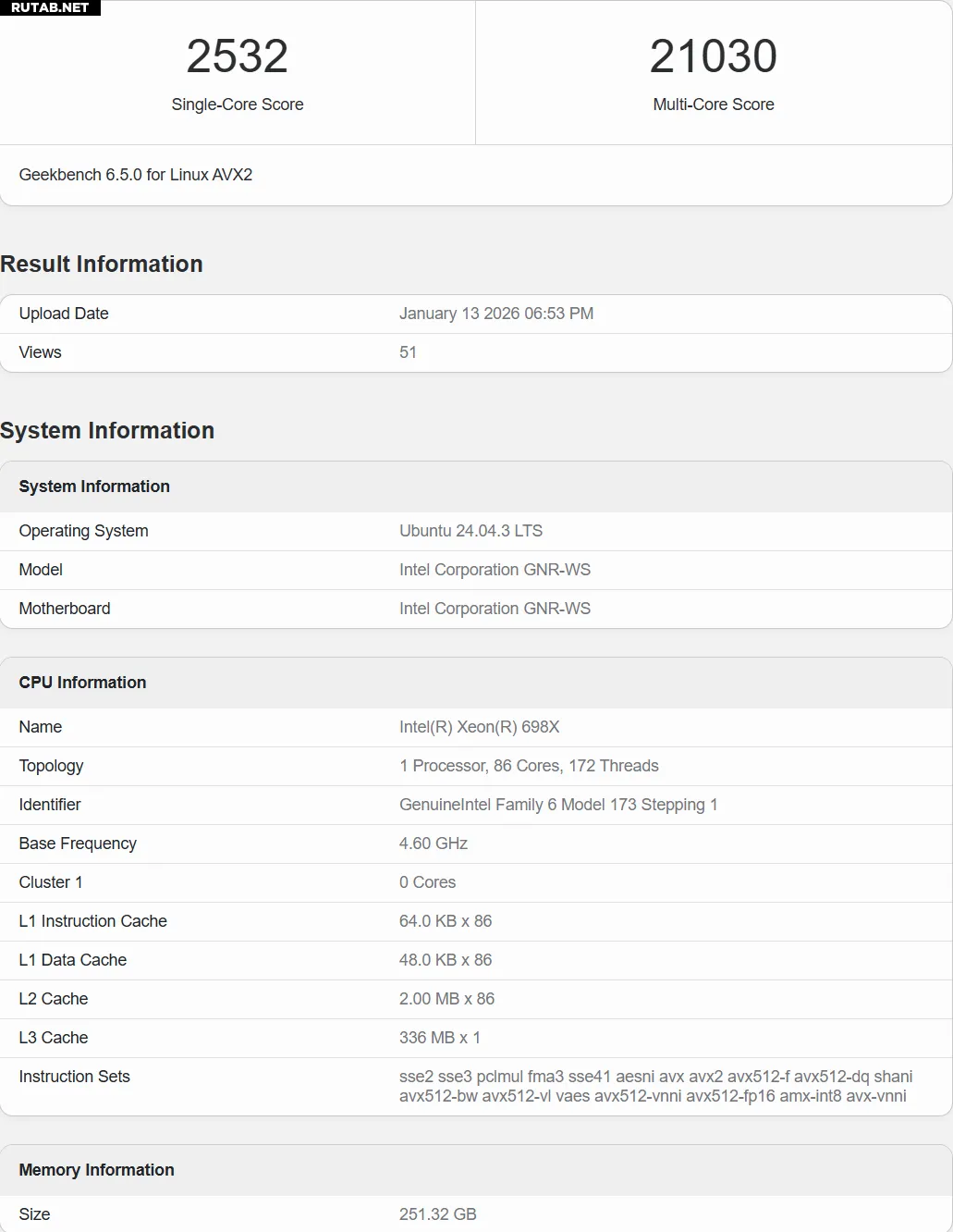 Предварительные результаты производительности в бенчмарке Geekbench 6 (2532 балла Single-Core / 21030 баллов Multi-Core) следует воспринимать с большой долей скептицизма. Эта программа известна проблемами с масштабированием производительности при таком большом количестве ядер, из-за чего полученные результаты парадоксально ниже, чем у потребительского Core Ultra 9 285K. Истинный потенциал Xeon 698X покажут только профессиональные приложения для рендеринга и инженерных расчётов.