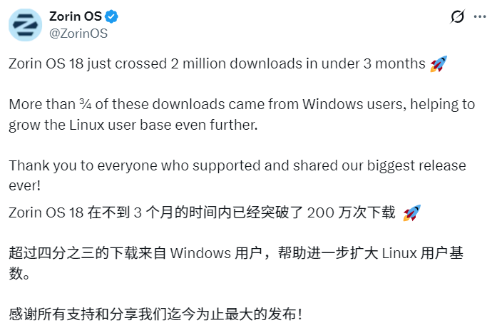 «Zorin OS 18 преодолела отметку в 2 миллиона загрузок менее чем за три месяца, причем более трех четвертей загрузок приходится на пользователей Windows, что еще больше расширяет базу пользователей Linux. Спасибо всем, кто поддержал и поделился нашим самым масштабным релизом за всю историю», — заявили разработчики в официальном аккаунте.