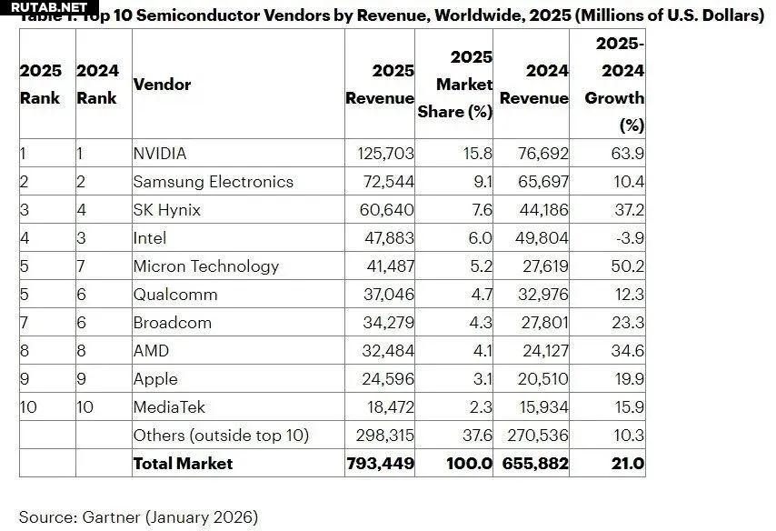 В рейтинге десяти крупнейших производителей NVIDIA лидирует с огромным отрывом, показав оборот в 125,7 млрд долларов (~10 триллионов рублей) и став единственной компанией, преодолевшей отметку в 100 млрд долларов. Её рост составил 63,9% по сравнению с предыдущим годом, что является самым высоким показателем в топе.