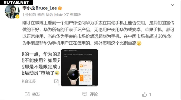 Технический директор подразделения потребительских товаров Huawei Ли Сяолун (Ли Сяолун) в своём микроблоге Weibo разъяснил важный момент о совместимости продукции компании. Он отметил, что все умные часы и фитнес-браслеты Huawei могут полноценно работать не только с телефонами Huawei, но и с любыми смартфонами на Android и iOS. «Это потому, что наша реклама была недостаточно хороша. Все часы и фитнес-браслеты Huawei можно использовать в обычном режиме независимо от того, использует ли пользователь телефон Huawei, Android или Apple», — написал он.