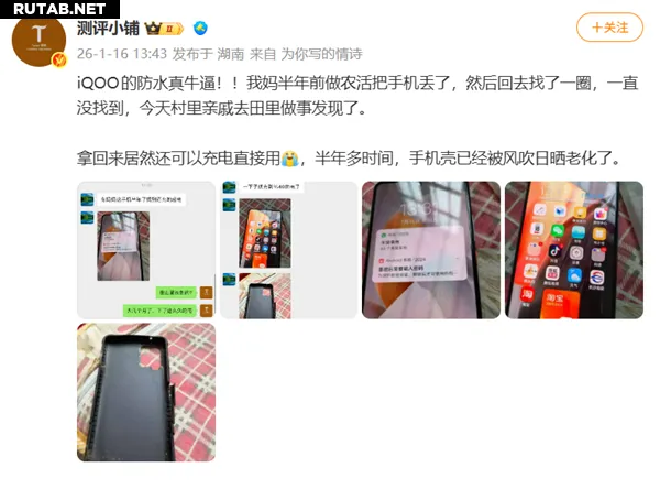 «Водонепроницаемость iQOO просто невероятная!! Моя мама полгода назад потеряла телефон, работая в поле. Мы искали, но так и не нашли. Сегодня деревенский родственник, работая на том же участке, обнаружил его. Принесли обратно, и он до сих пор заряжается и работает! За полгода чехол от ветра и солнца уже состарился», — написал блогер.