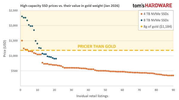 Аналитики TomsHardware подсчитали, что средний вес 8-терабайтного M.2 SSD составляет 8,2 грамма. При средней цене такого накопителя в 1476 долларов США его стоимость за грамм (184 доллара) превышает стоимость золота (148 долларов). Даже некоторые 4-терабайтные корпоративные модели SSD приближаются по этому показателю к цене золота.