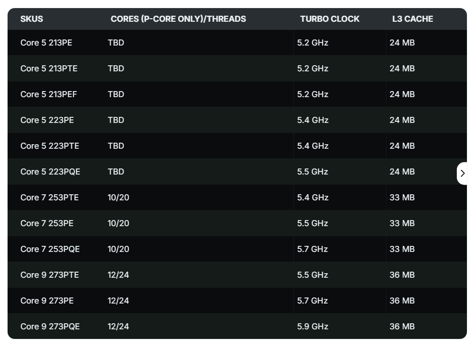 Тактовые частоты начинаются с 5.2 ГГц у младшей модели Core 5 213PE и достигают 5.9 ГГц у топового процессора Core 9 273PQE.