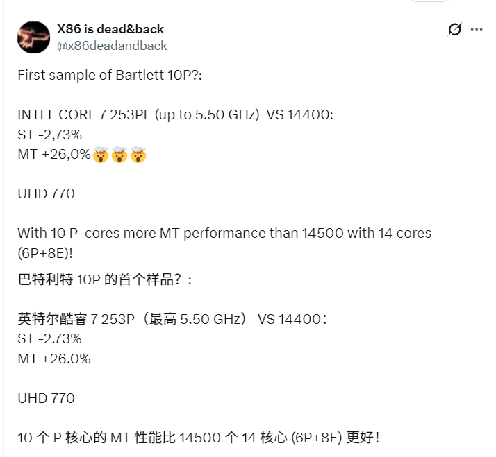 Intel представила процессор с 10 чистыми P-ядрами: тесты показывают превосходство над гибридными моделями