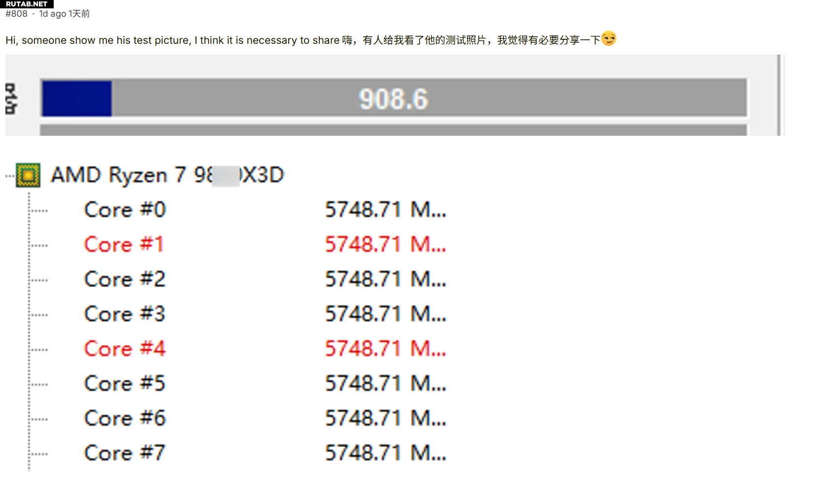 Однако частота Ryzen 7 9850X3D, судя по всему, не ограничивается заявленными 5.6 ГГц. На форуме Overclocks появились результаты тестов, где частота на всех ядрах достигла 5.75 ГГц, а результат в CPU-Z составил 908.6 баллов.