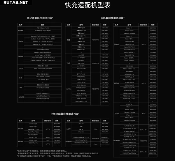 Согласно официальному списку совместимости, помимо продукции Xiaomi и Redmi, устройство поддерживает быструю зарядку ноутбуков Apple, Lenovo, ASUS, Dell и Huawei, а также смартфонов Apple, Huawei, Honor, vivo и OPPO.