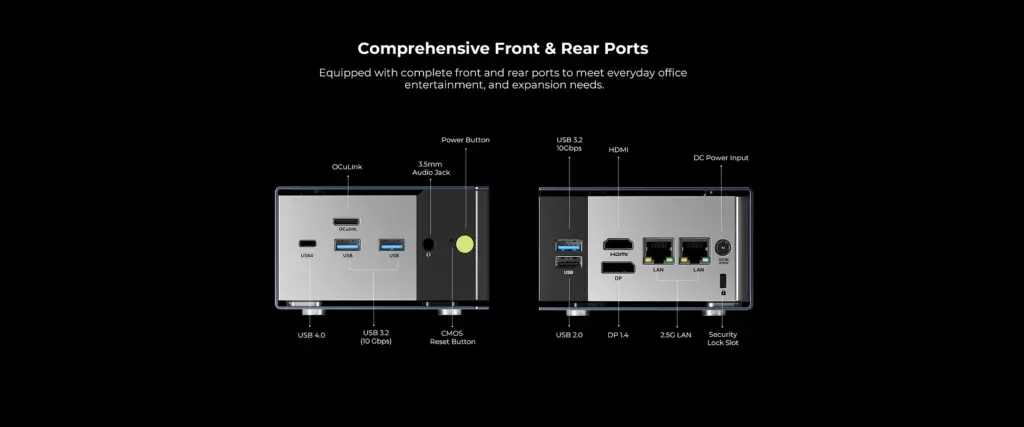 Система оборудована полнофункциональным портом USB4 и интерфейсом OCuLink. Порт USB4 поддерживает передачу данных на скорости 40 Гбит/с, вывод изображения DisplayPort 1.4 с разрешением до 8K@60 Гц и зарядку по стандарту Power Delivery мощностью до 100 Вт. Порт OCuLink позволяет подключать внешние видеокарты (eGPU) с пропускной способностью до 64 Гбит/с по шине PCIe Gen4.