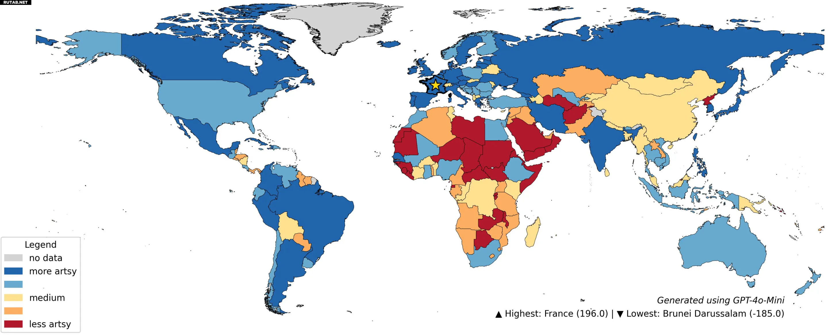 Карта рейтинга ChatGPT на тему «Где люди более артистичны». Автор: Platforms and Society (2026). DOI:10.1177/2976862425140891