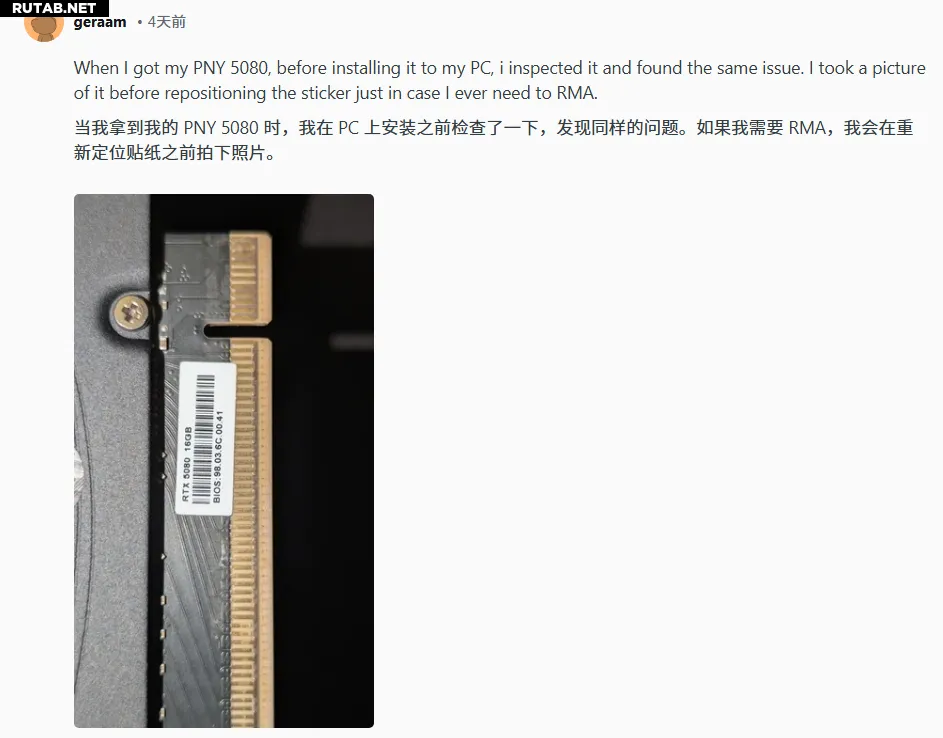 Пользователи сообщают о серьёзной проблеме с новыми видеокартами PNY серии RTX 50. Как выяснилось, на некоторые модели, включая RTX 5070 Ti и RTX 5080, на заводе была наклеена гарантийная пломба таким образом, что она перекрывает часть контактов (так называемых «золотых пальцев») интерфейса PCIe.