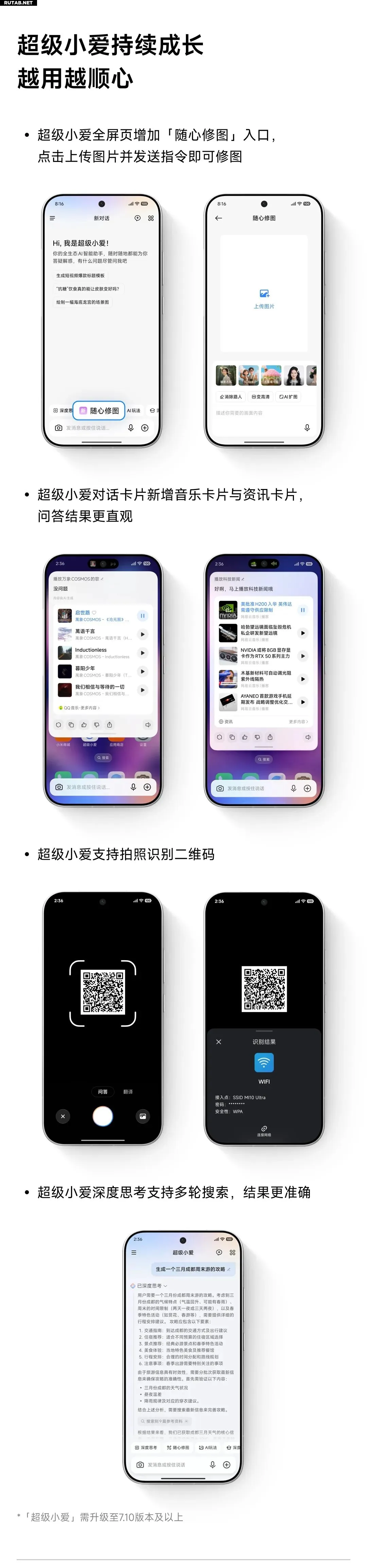 Голосовой помощник «Супер Сяоай» стал ещё умнее. На его полноэкранной странице появился вход в функцию «Умное ретуширование»: достаточно загрузить фото и отправить голосовую команду (например, «осветли лицо» или «убери лишний объект»), и ИИ выполнит задачу. Помощник научился распознавать QR-коды через камеру, а его функция «Глубокого размышления» теперь поддерживает многоуровневый поиск для более точных и развёрнутых ответов.