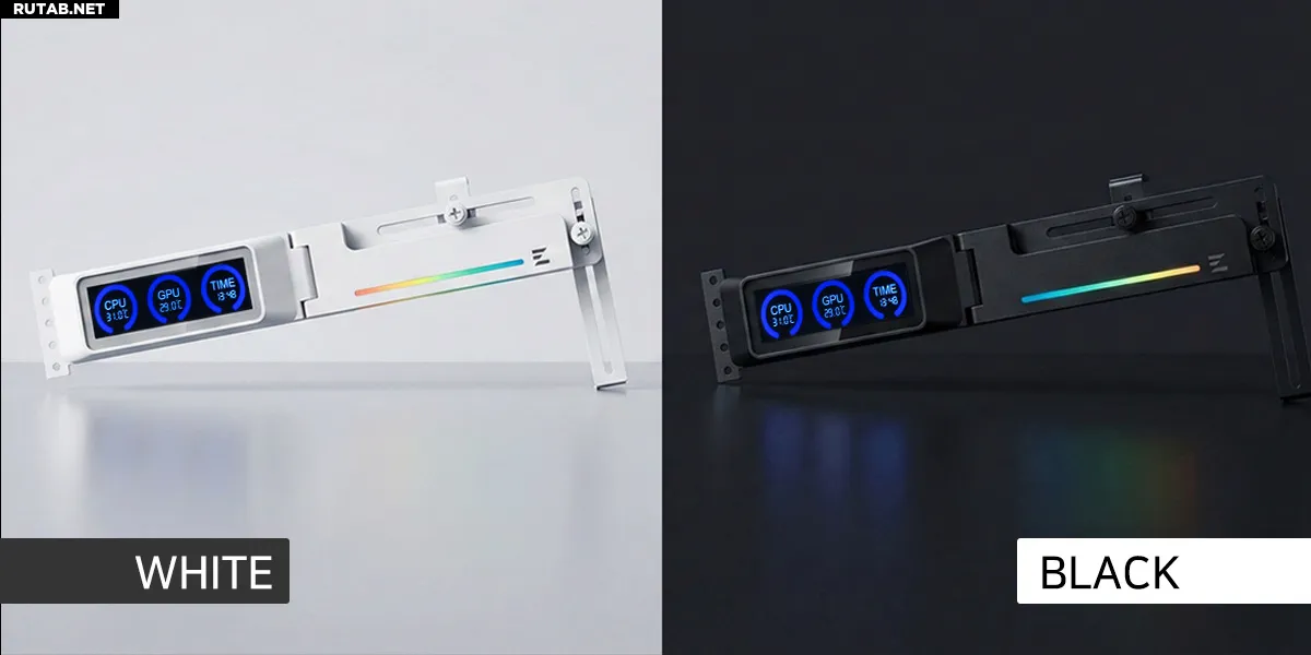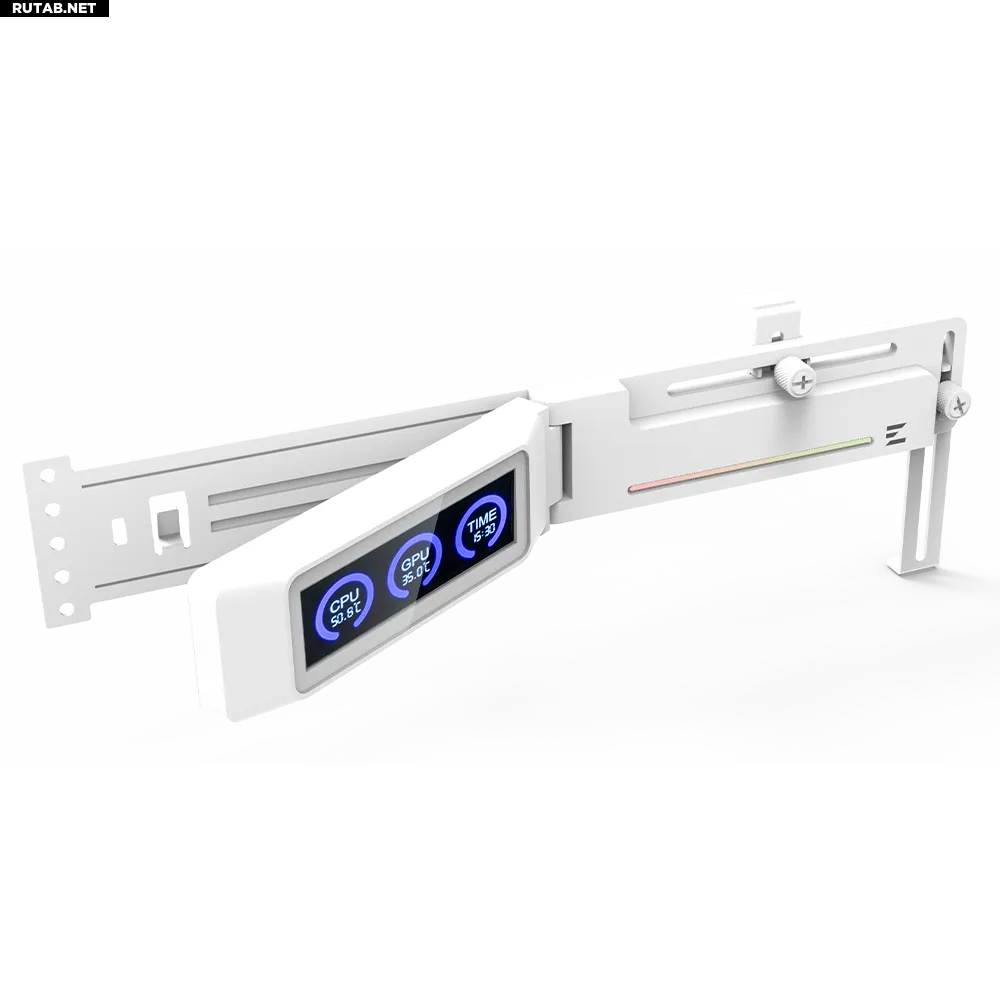 Устройство предназначено для поддержки тяжёлых современных видеокарт и предотвращения их провисания. Однако его главная особенность — компактный ЖК-экран, расположенный на регулируемом кронштейне. Это позволяет настроить угол наклона для лучшего обзора в зависимости от расположения корпуса ПК.