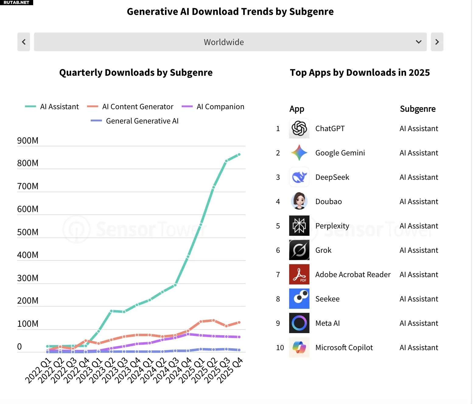 Рост сегмента можно объяснить несколькими факторами. Во-первых, огромную роль сыграла популярность ИИ-ассистентов среди пользователей: все 10 самых скачиваемых приложений были именно ассистентами. Лидерами этой группы стали ChatGPT от OpenAI, Google Gemini и DeepSeek. Только один ChatGPT принес 3,4 миллиарда долларов (~272 млрд рублей) глобальной выручки от внутриигровых покупок — эту цифру мы уже сообщали в конце прошлого года.