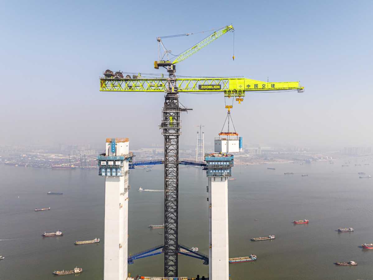 Главная башня строящегося моста Шицзыян преодолела отметку в 300 метров в четверг после успешного подъёма сегмента конструкции. [Фото: chinadaily.com.cn]