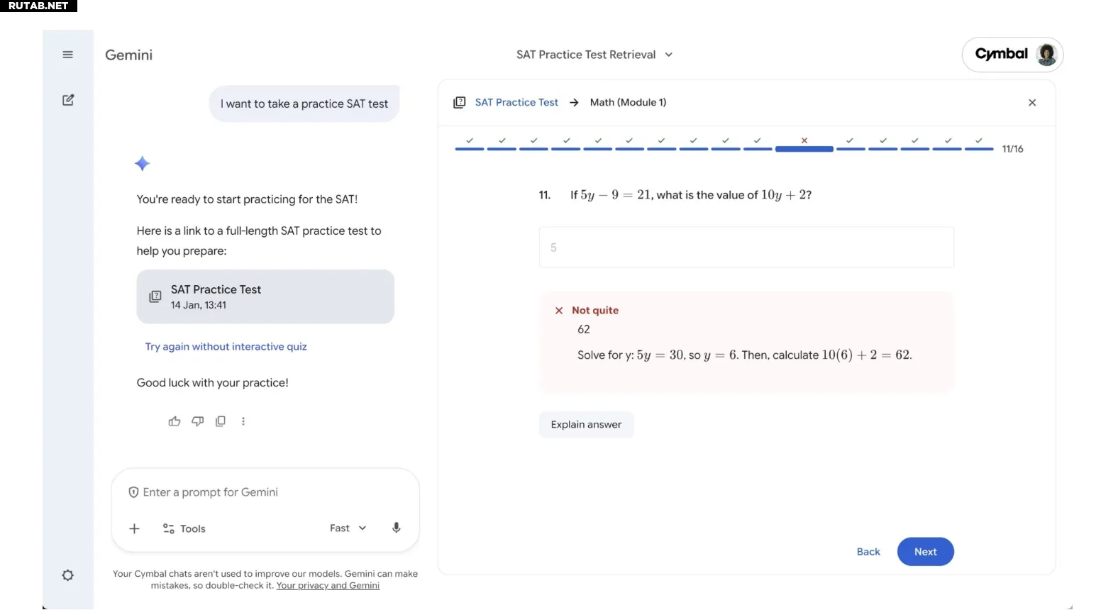 Студенты могут обратиться к Gemini, набрав «Я хочу пройти пробный тест SAT», и ИИ предоставит им бесплатный пробный экзамен. Затем Gemini анализирует результаты, выделяя сильные стороны и определяя области, требующие дополнительной проработки. Также предлагаются подробные объяснения к каждому неверному ответу.