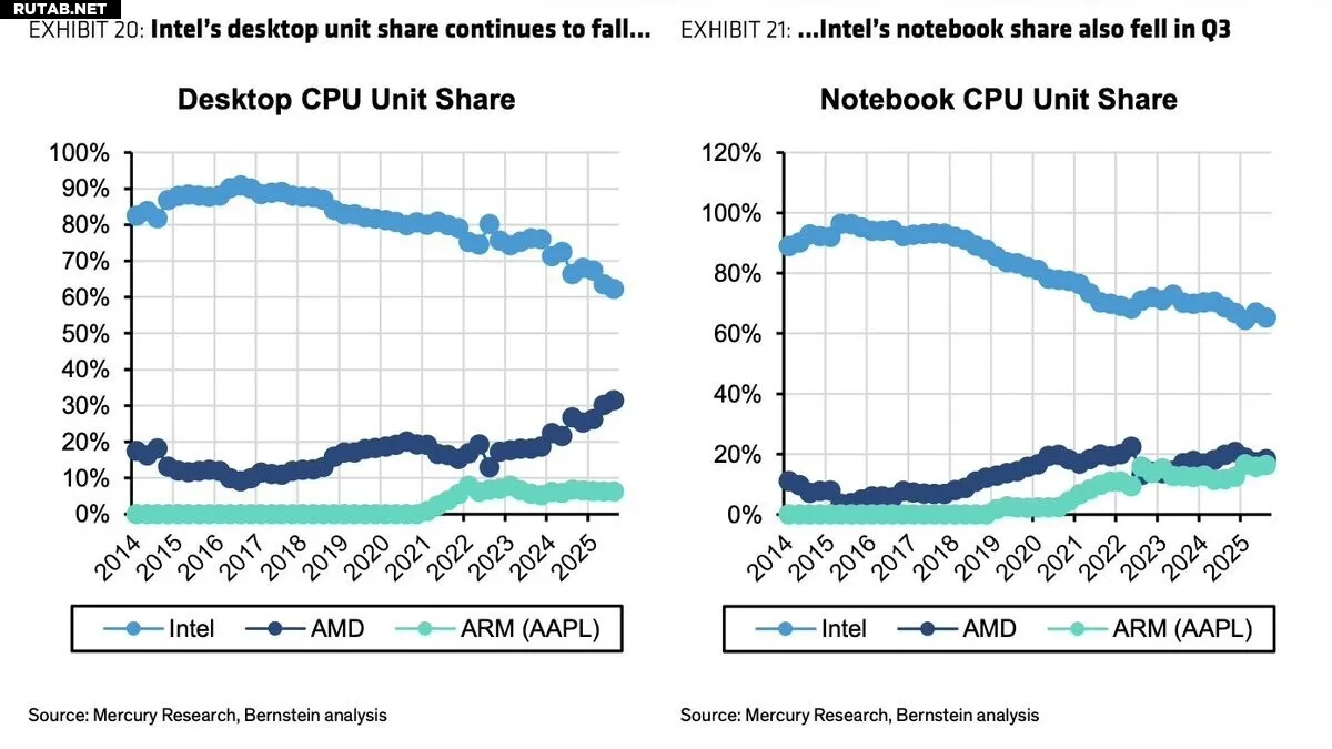 На рынке настольных компьютеров Apple также демонстрирует прогресс, заняв около 10%. При этом основным бенефициаром сокращения доли Intel стала AMD, что указывает на сохраняющуюся популярность платформы x86 среди пользователей десктопов.