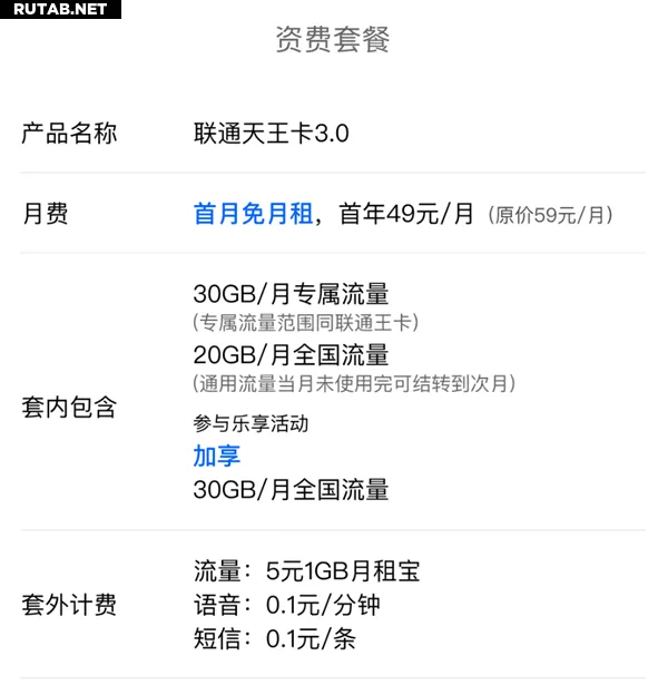 Пакет включает 80 ГБ мобильного интернета в месяц, из которых 30 ГБ являются выделенным трафиком, а 50 ГБ — общим. После исчерпания включенного пакета стоимость дополнительного гигабайта составит 5 юаней. Звонки тарифицируются по 0,1 юаня в минуту, SMS — по 0,1 юаня за сообщение.