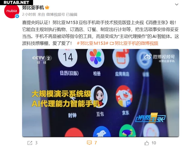 Сегодня компания Nubia в своём официальном аккаунте в Weibo объявила, что технологический превью-помощника Doubao для смартфона Nubia M153 был показан в программе «Потребительский выбор» на финансовом канале CCTV.