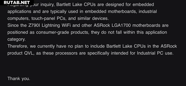 Как пояснила компания ASRock, процессоры Bartlett Lake ориентированы на встраиваемые (embedded) решения. Они предназначены для промышленных ПК, сенсорных панелей, встраиваемых материнских плат и подобного оборудования. Поэтому материнские платы ASRock для розничного рынка, такие как модели на чипсете Z790 с сокетом LGA1700, не получат поддержку этих процессоров и соответствующих обновлений BIOS.