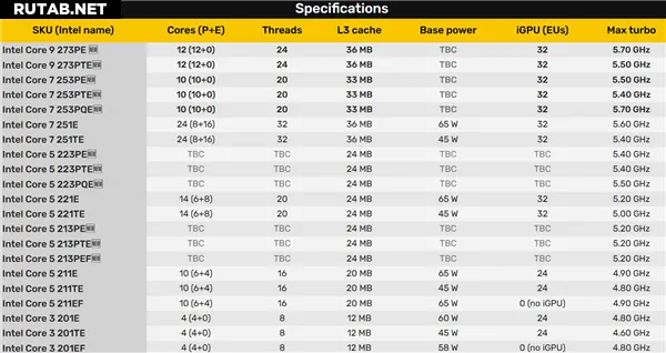 Эти процессоры относятся к обновлённой линейке Core 2, а не к современному семейству Core Ultra. Среди моделей с чисто большими ядрами значатся 12-ядерные Core 9 273PE/273PTE, 10-ядерные Core 7 253PE/253PTE/253PQE и 4-ядерные Core 3 201E/201TE/201EF.