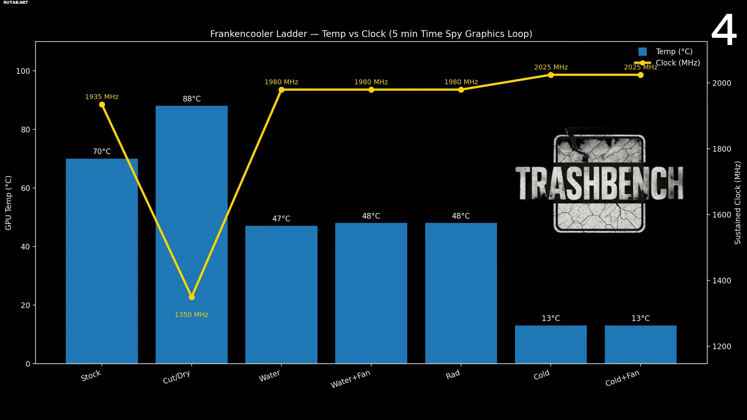 Вентиляторы снова не дали никакого эффекта. TrashBench не пробовал подключать радиатор, но показал несколько эффектных кадров, на которых вся видеокарта покрыта инеем, что доказывает успех эксперимента.