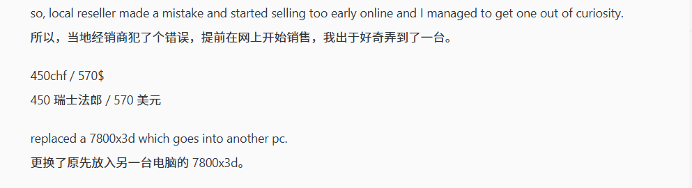 Пользователь заплатил за процессор 450 швейцарских франков (около 570 долларов США). Он уже установил Ryzen 7 9850X3D в свою систему, заменив им предыдущую модель Ryzen 7 7800X3D.