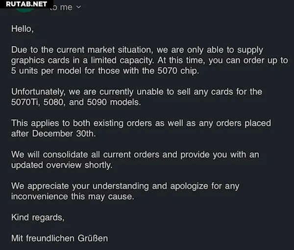 Хотя не все модели и бренды показывают столь резкий рост, тенденция к подорожанию стала общей. Некоторые пользователи получили от ритейлеров уведомления о крайне ограниченных запасах: RTX 5070 Ti, 5080 и 5090 отсутствуют в наличии, а на RTX 5070 установлен лимит в 5 штук на покупателя.
