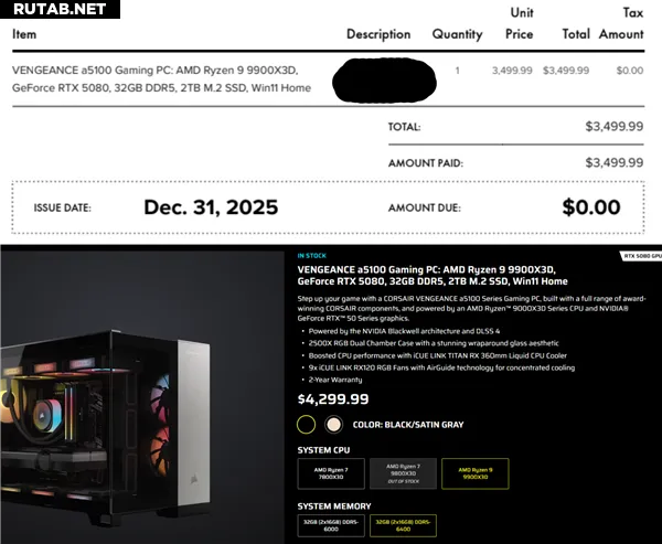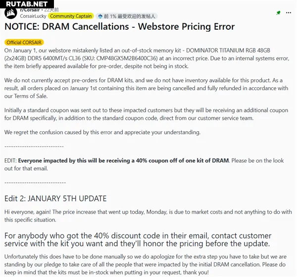 Проблемы с ценами и отменами заказов коснулись не только видеокарт, но и оперативной памяти. Пользователь, заказавший комплект Corsair DDR5 объёмом 48 ГБ за 240 долларов, получил отмену заказа с формулировкой «ошибка в цене». В качестве компенсации компания предложила купон на 40% скидки для следующей покупки.
