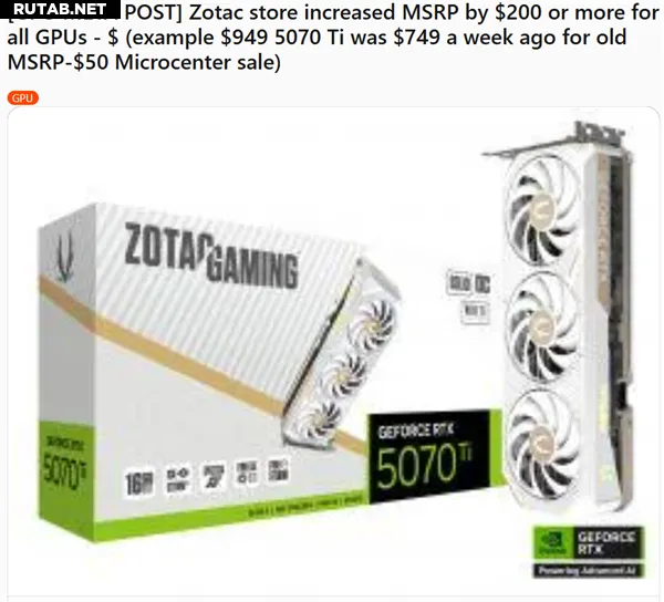 Пользователи Reddit сообщают, что такие бренды, как Zotac и Gigabyte, внезапно и значительно подняли цены. Например, видеокарта Zotac GeForce RTX 5070 Ti за неделю подорожала с 749 до 949 долларов США (с ~60 000 до ~76 000 рублей).