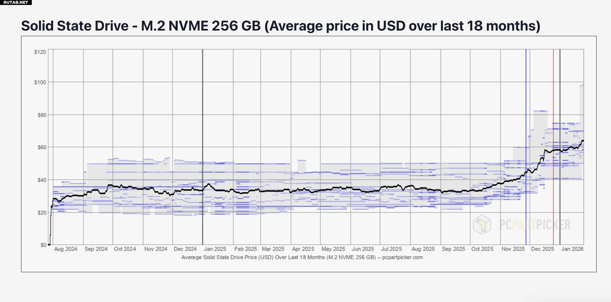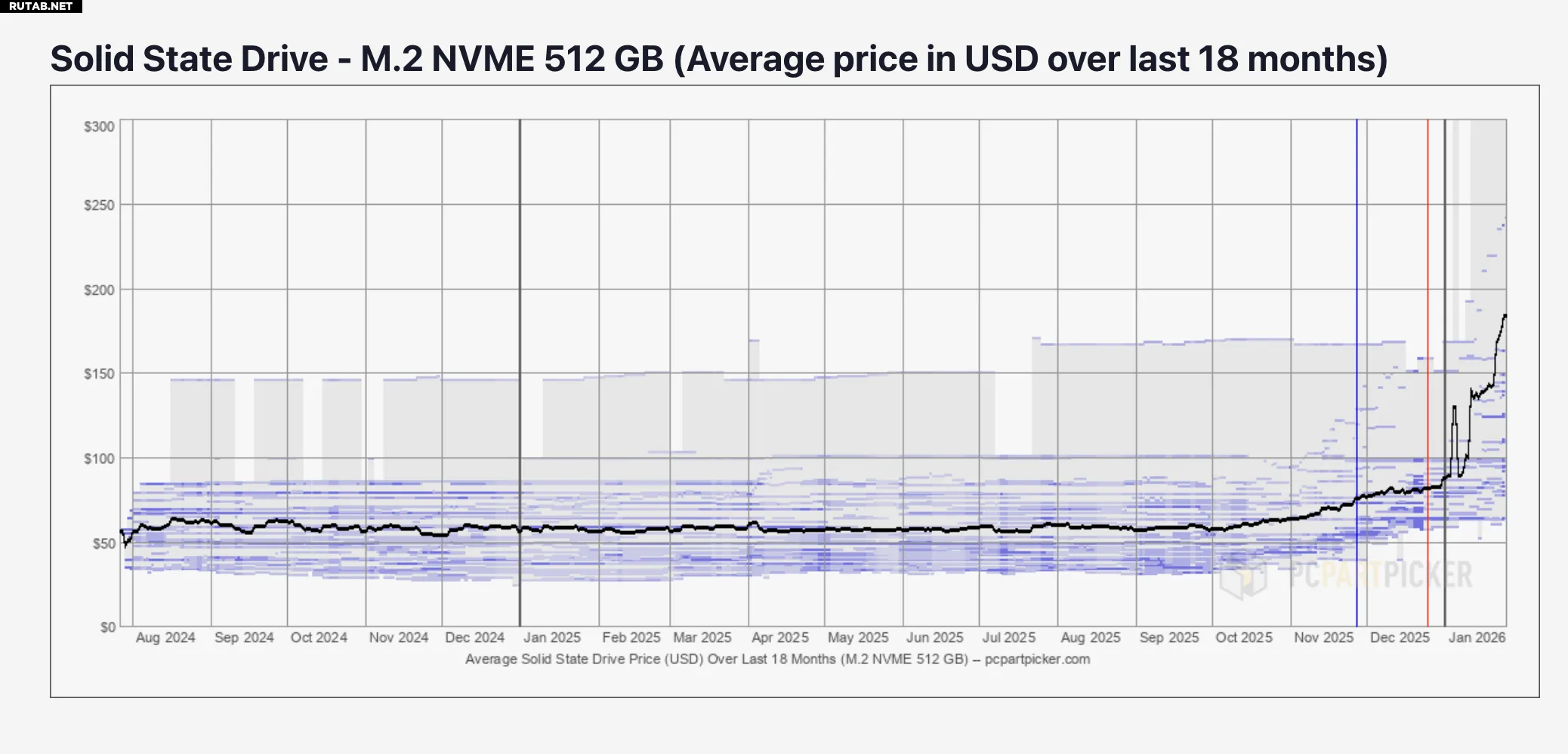 Фактически, розничные цены на SSD уже растут день ото дня. Данные сервиса PCPartPicker показывают, что с октября 2025 года средняя стоимость SSD различных конфигураций выросла на 18%.