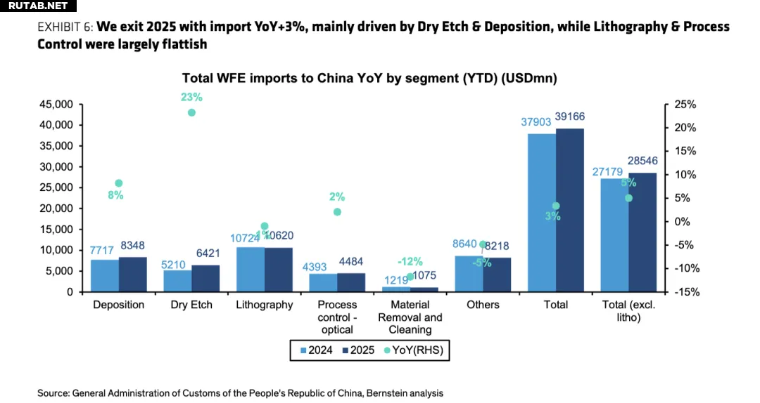 Помимо литографии, в прошлом году заметно вырос импорт ещё двух критически важных типов оборудования: установок для сухого травления и осаждения слоёв. Их импорт составил 64,21 млрд и 83,48 млрд долларов соответственно, показав рост на 23% и 8%.