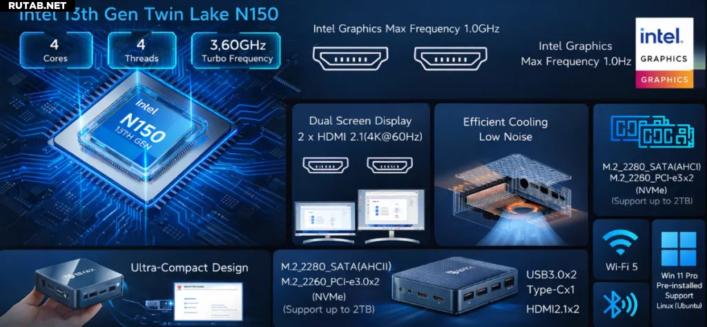 Система работает на процессоре Intel 13-го поколения N150 с 4 ядрами и частотой до 3.6 ГГц. Он плавно справляется с офисным ПО, веб-сёрфингом, потоковым видео, онлайн-встречами и лёгкими задачами. Хотя он не предназначен для тяжёлых игр или требовательной творческой работы, для повседневного использования его производительности достаточно.
