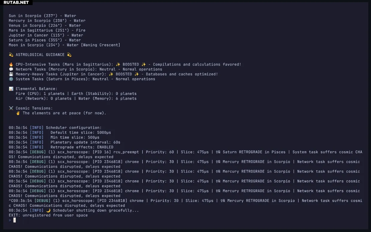 Тем не менее, scx_horoscope — это полностью функциональный планировщик задач для ЦП, который загружается в ядро Linux и определяет приоритеты процессора на основе «реального положения планет, знаков зодиака и астрологических принципов». Это именно та странная тема, в которую я люблю погружаться во вторник после обеда.
