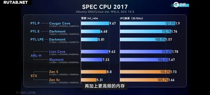 Редакция ресурса «笔吧» провела тестирование, используя бенчмарк SPEC CPU 2017 для оценки целочисленной производительности. Сравнение проводилось на платформе LPDDR5 между процессорами Intel Arrow Lake и Panther Lake, а также AMD Strix Halo с ядрами Zen 5 и Zen 5c.