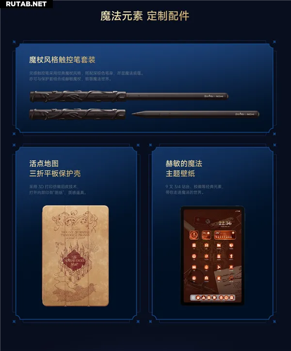 В комплект входит фирменный аксессуар — трёхсекционный чехол в стиле «Карты Мародёров», выполненный из искусственно состаренной кожи. Стилус оформлен как волшебная палочка в комплекте с футляром, повторяющим дизайн палочки Гермионы Грейнджер.