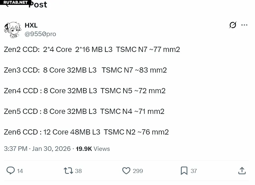 Что ещё более впечатляюще, при переходе на 2-нм техпроцесс площадь кристалла увеличится всего на 5 мм² — с 71 мм² у Zen5 до 76 мм² у Zen6. Это демонстрирует исключительную эффективность использования площади благодаря скачку в производственных технологиях.